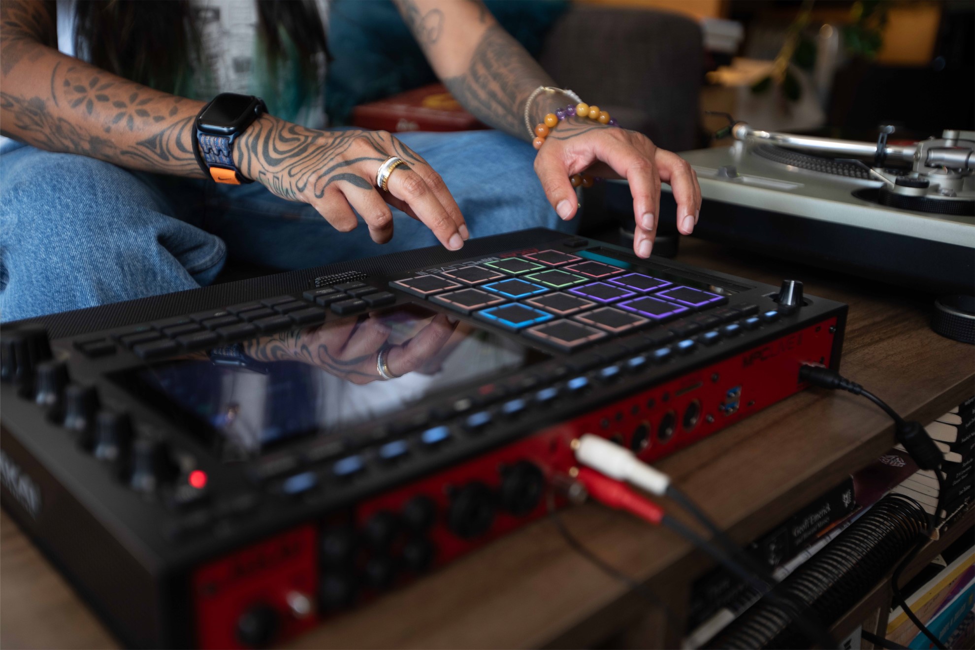 MPC Live IIIはスマートフォンやコンピューターと接続可能なUSB-Cポート、CV/Gate出力を備え、外部機器、モジュラーシンセ、DAWとシームレスに統合可能です。内蔵コンデンサーマイク、パワフルなステレオモニタースピーカー、オーディオインターフェース、充電式バッテリー、そして2つのXLR/TRSコンボ入力、サンプルのための十分なスペースが確保された128GBの内部ストレージ(SSDやSDカードで拡張可能)を備えた、真のポータブル・プロダクションセンターです。